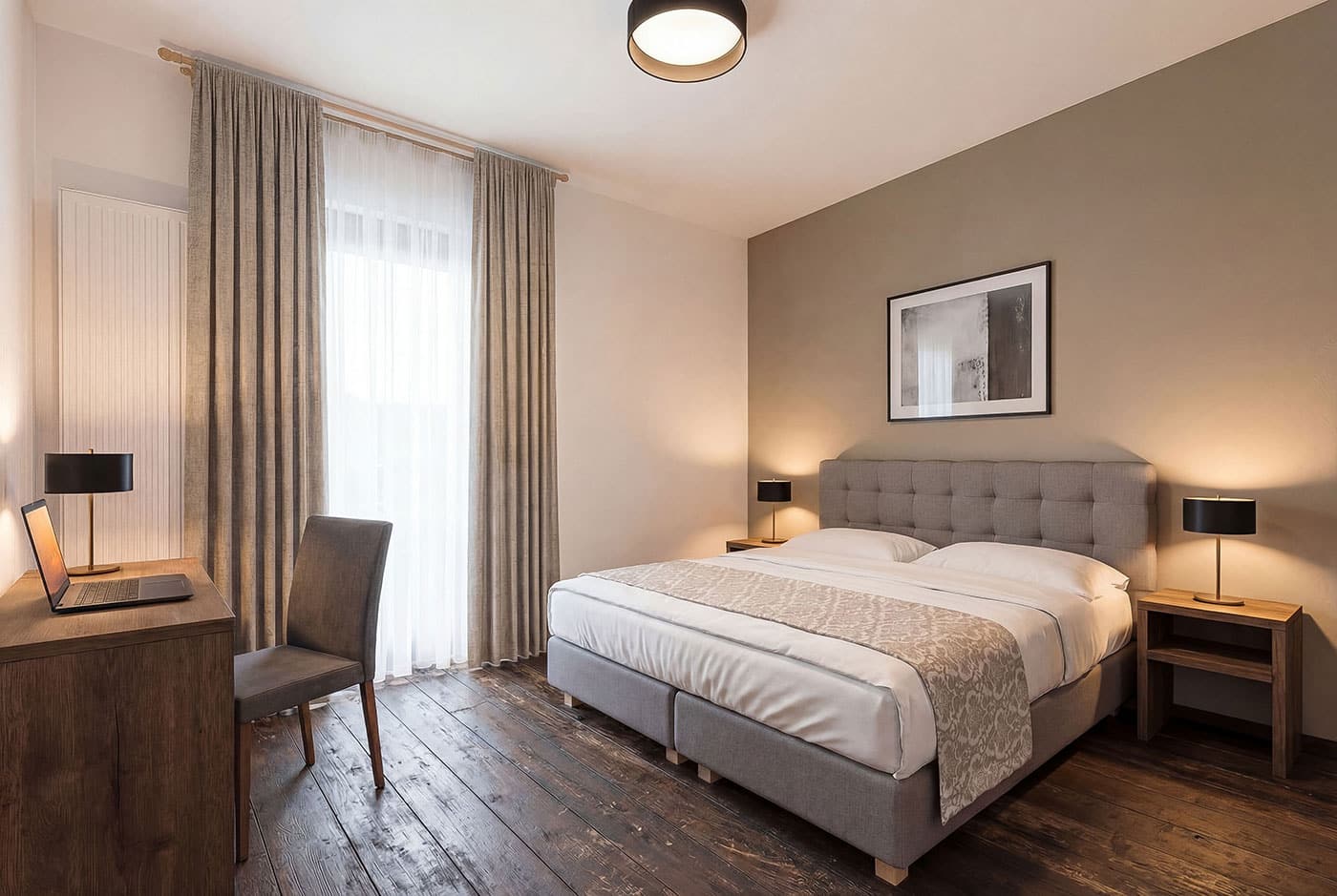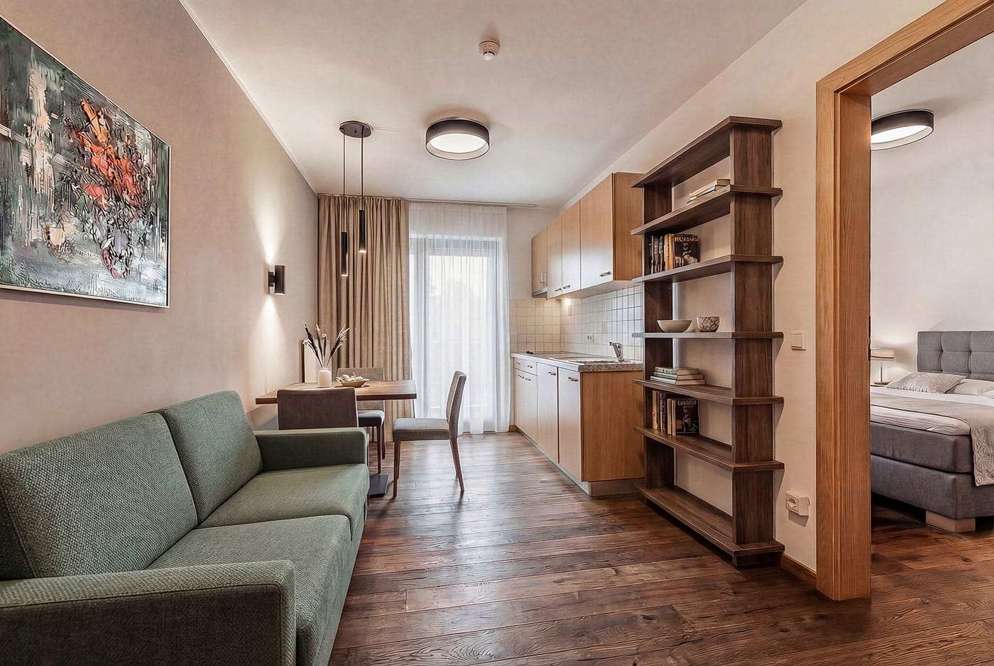 In den Apartments erwartet Sie ein moderner Naturstil mit viel Holz, Stoffen und harmonischen Farben – komfortabel, wohnlich und zeitlos.